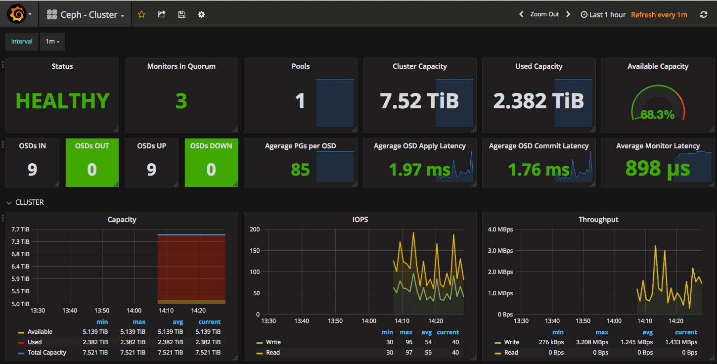 Переходим в добавленный дашборд и, если все действия были выполнены правильно, то наблюдаем информацию о нашем Ceph кластере.