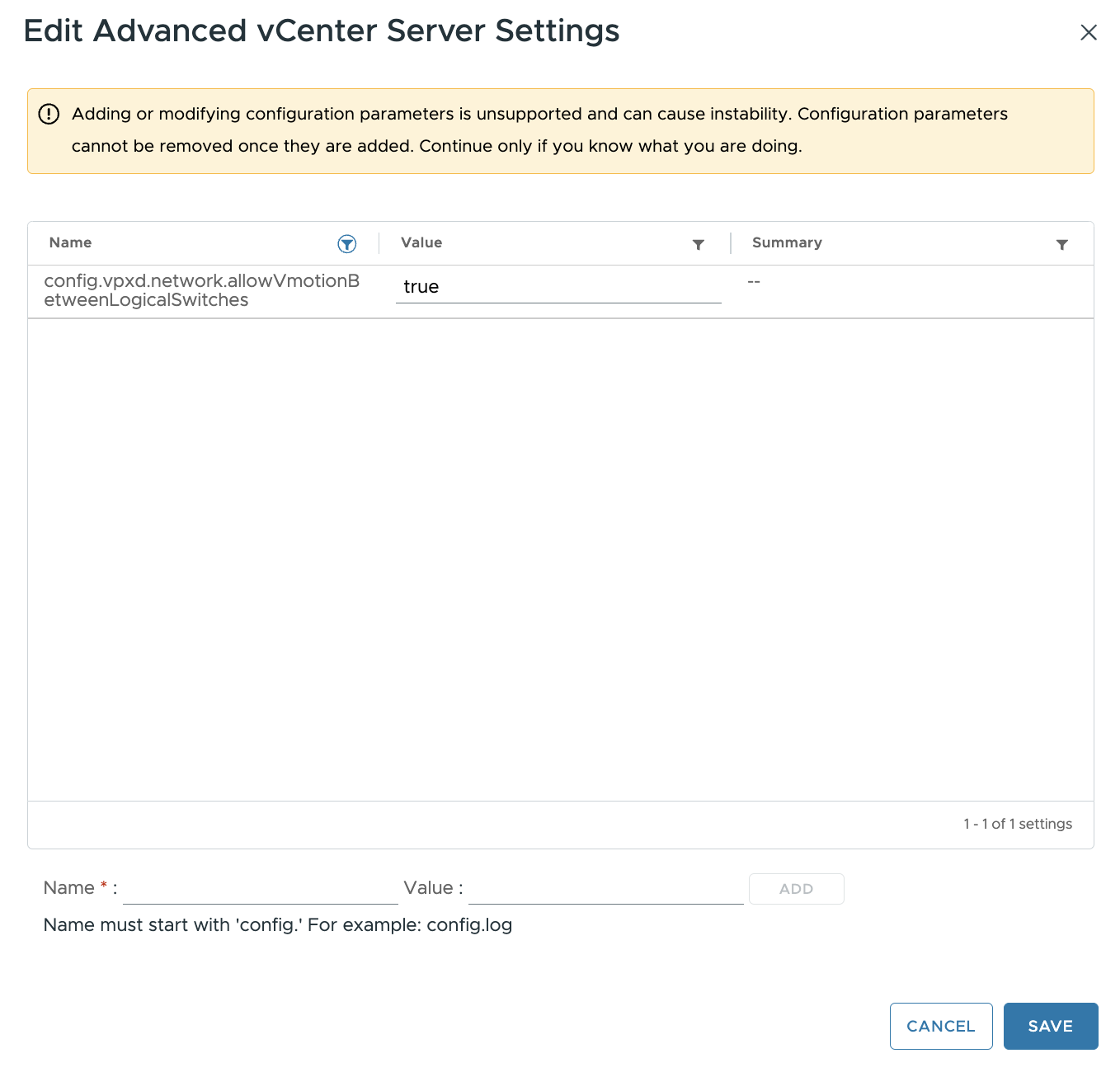 Чтобы разрешить эти vMotions, перейдите к дополнительным настройкам в vCenter и добавьте следующий параметр со значением TRUE.config.vpxd.network.allowVmotionBetweenLogicalSwitches