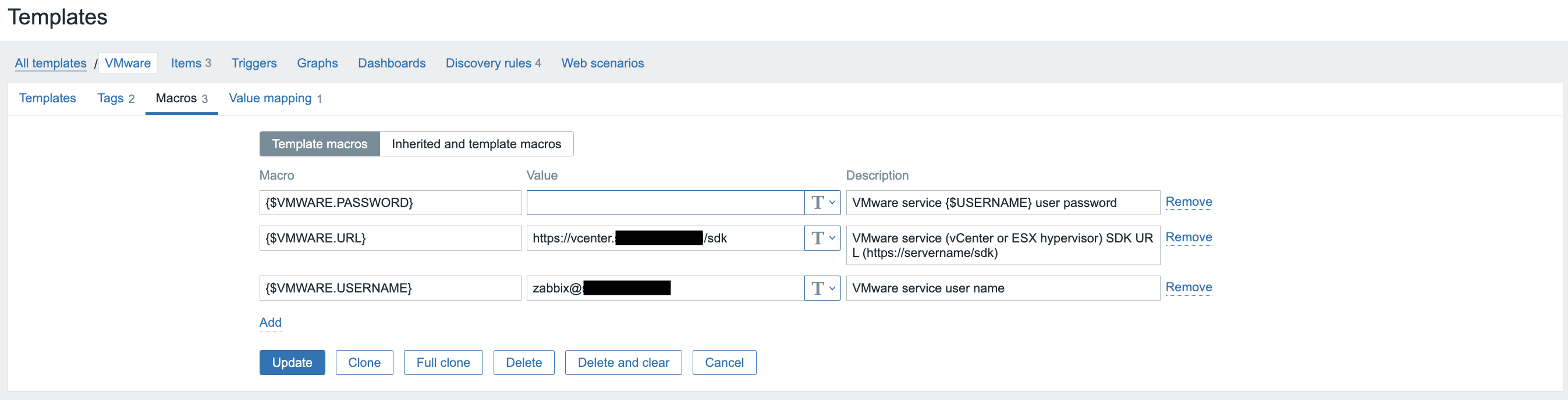 - {$VMWARE.USERNAME} - имя RO пользователя для Zabbix.