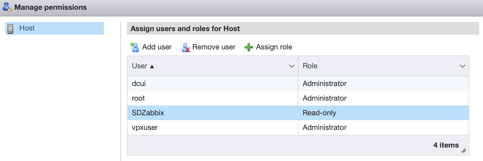 Далее присваиваем права на пользователя, для мониторинга достаточно Read-only: «HOST» => «ACTIONS» => «PERMISSIONS»